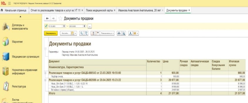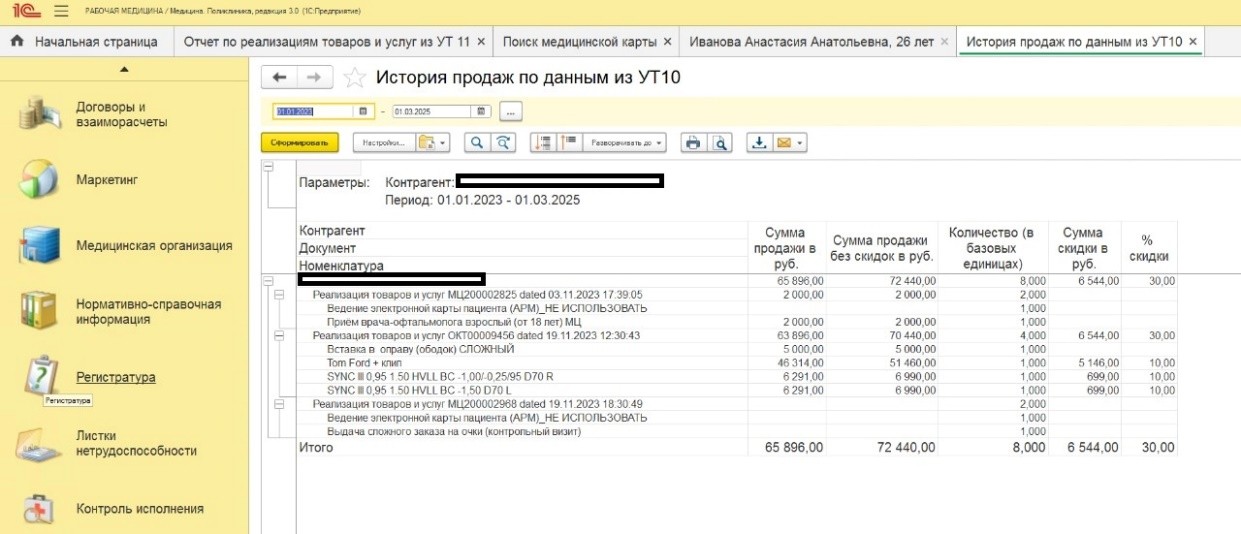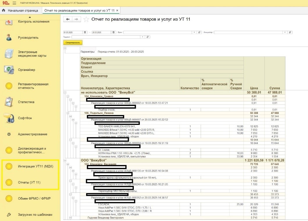 Для удобства работы медицинского персонала и исключения их работы в «1С:Управления торговлей» также были на стороне «1С:Медицины» с использованием http-сервиса разработаны 4 интерактивных отчета, которые при формировании пользователем «тянут» нужную информацию из торговой конфигурации. Это продажи по клиенту с детализацией до номенклатуры, заказы и реализации с возможностью отборов по дате, контрагенту, подразделению, врачу.
