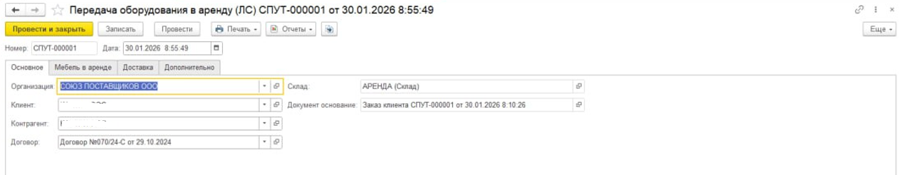 Типовой документ «Реализация товаров и услуг» используем для сценария «выкуп оборудования из аренды», который реализован через документ «Изменение условий аренды». Новая подсистема аренды автоматически создает документ на основании заказа клиента и подтягивает оборудование из заказа.