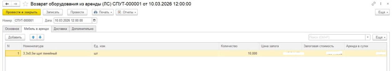 Когда происходит возврат, менеджер использует документ «Возврат оборудования из аренды». Документ отражает возврат оборудования и обновляет данные по составу аренды у клиента.