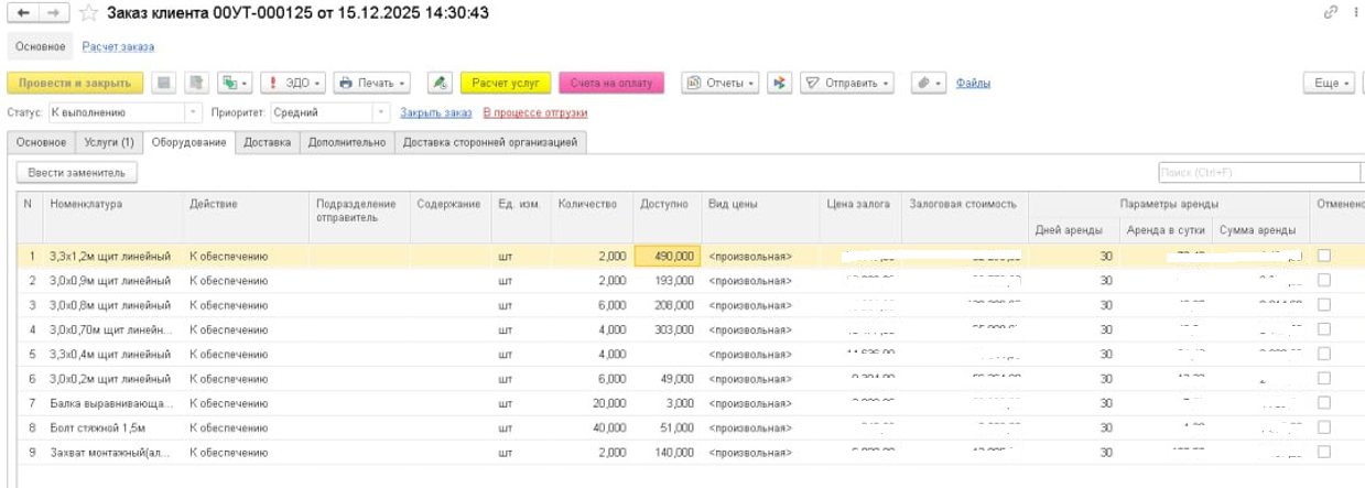 Передачу оборудования в аренду менеджер может оформить только после поступления оплат по заказу: предоплаты аренды/доставки и обеспечительного платежа (залога). Для пользователей действует запрет печати отгрузочных документов по неоплаченным заказам.