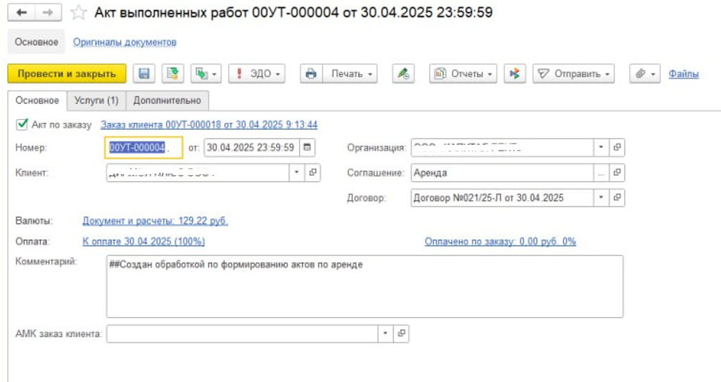 Для ежемесячного закрытия аренды сделали обработку-помощник, который формирует документы и печатные формы по выбранному периоду и клиенту.