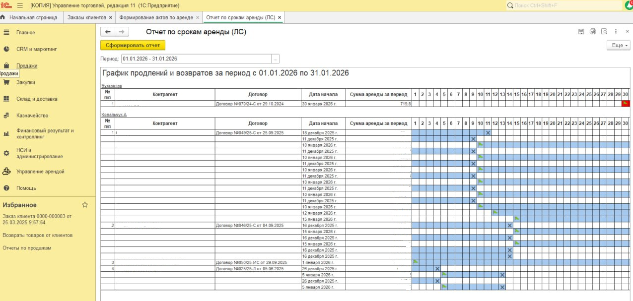 Реализовали отчеты по аренде и взаиморасчетам с контрагентами: какое оборудование находится в аренде, сроки аренды, кто и сколько должен по аренде и сопутствующим начислениям.