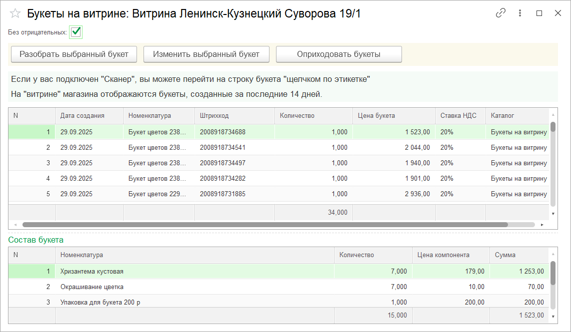 На «Витрине букетов» отображены собранные и не проданные букеты по дате сборки, цене и списку компонентов.