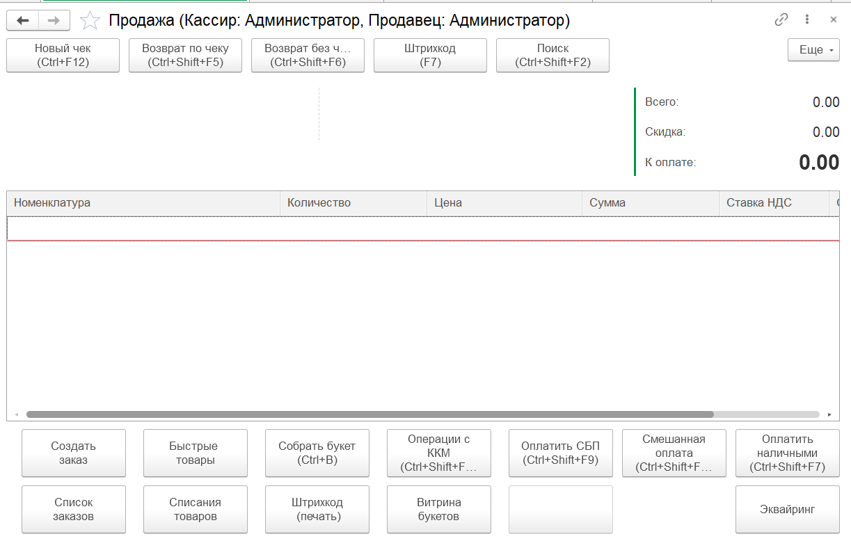 В типовом РМК появились новые кнопки «Создать заказ», «Список заказов», «Быстрые товары», «Списание товаров», «Собрать букет», «Штрихкод» и «Витрина букетов». Разберем функционал каждой кнопки.