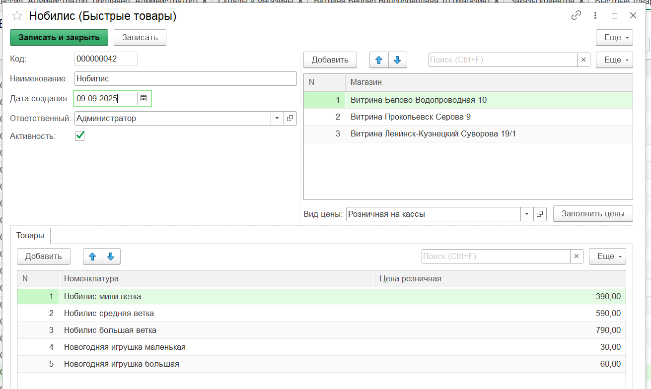 Элемент «Быстрые товары» — это группа, которая содержит список номенклатуры с установленными розничными ценами и торговыми точками «Магазины», где данная кнопка (группа) будет «видна». Указывается наименование группы, ее активность, дата создания и ответственный.