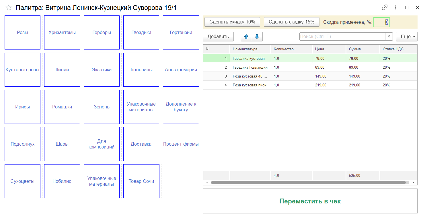 В РМК «1С:Управления торговлей» 11.5 внедрили несколько кнопок, позволяющих кассиру-флористу работать в одном окне, не переключаясь между вкладками.