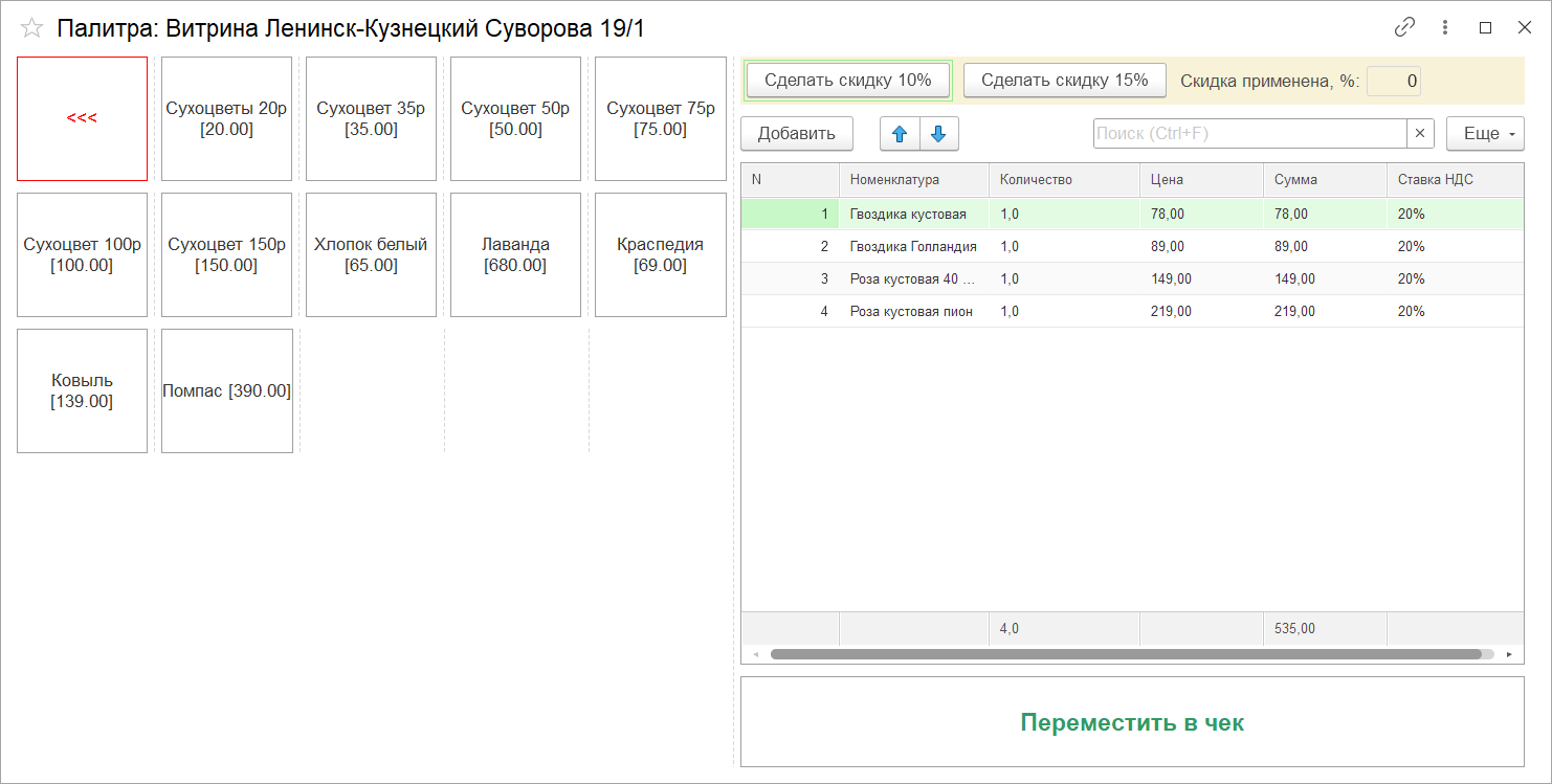 Как видно на скриншотах, в «Палитре» реализована возможность сделать скидки 10% и 15%. Данный «собираемый» интерфейс хорошо работает как на сенсорных экранах, так и на обычных мониторах с использованием мышки.