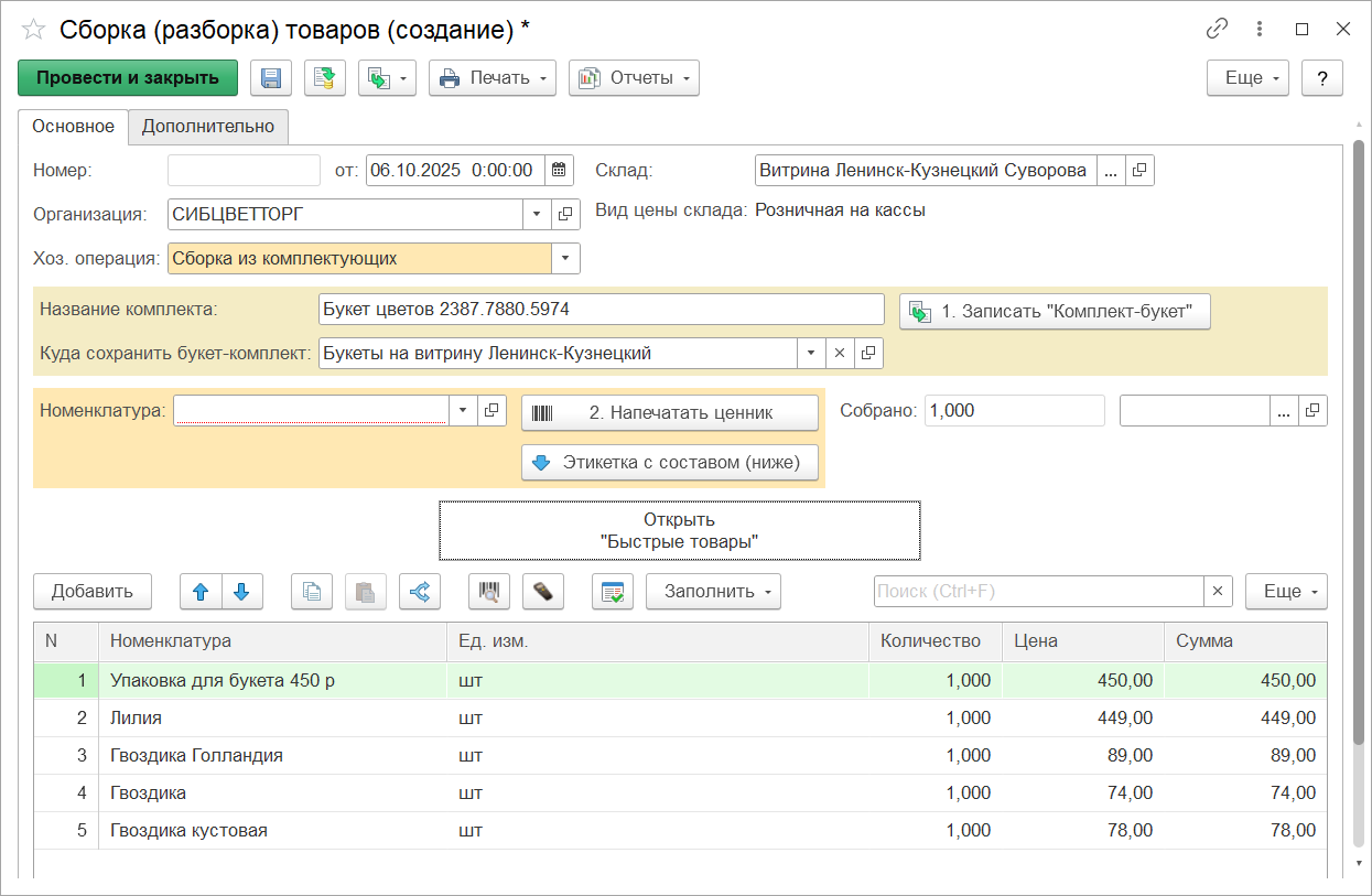 Флорист набирает состав компонентов через «Быстрые товары», создает букет. При этом рассчитывается розничная цена, печатается этикета (ценник) и этикетка с составом букета. Созданный документ «Сборки букета» списывает компоненты для букета и оприходует созданный «Букет цветов» на выбранный склад штатными методами типового документа «Сборка (разборка) товаров».