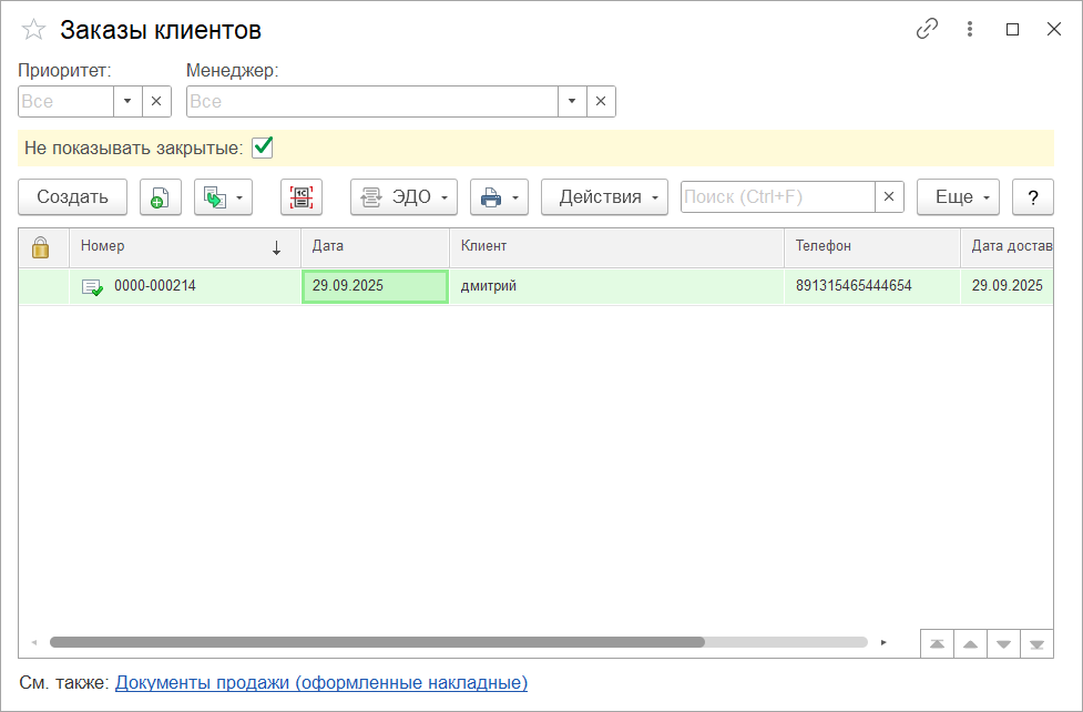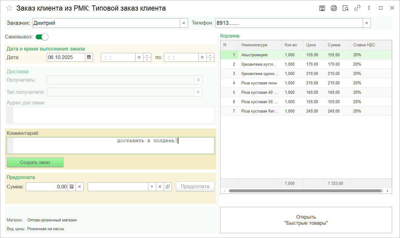 В основе «Заказа клиента» лежит одноименный типовой документ. По факту пользователь работает с собственной формой, в которой также присутствует интерфейс «Быстрых товаров». В форме заполняется лишь минимально достаточное количество информации для заказа.