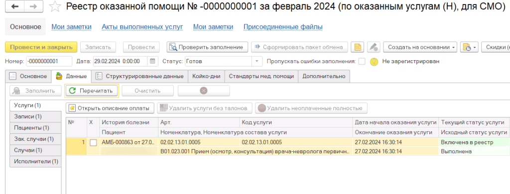 Заказчик использует решение 1С:Медицина, где ведет реестр оказанных услуг. Реестр услуг — это таблица, в которой по каждому пациенту фиксируются оказанные медицинские услуги, их стоимость, исполнители и основания для оплаты по договорам. Такие реестры формируются как для пациентов по обязательному (ОМС), так и по добровольному медицинскому страхованию, но требования к их содержанию и формату различаются.