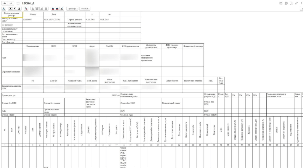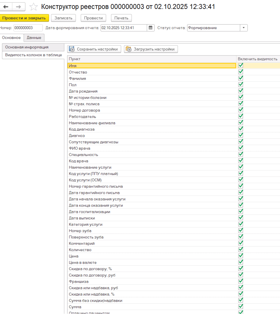 Конструктор поддерживает формирование сложных печатных форм, автоматически подтягивая данные из договоров и соглашений. Например, одна страховая компания может запросить реестр с указанием скидок, другая — с перечнем исследований, и конструктор сгенерирует оба отчета.