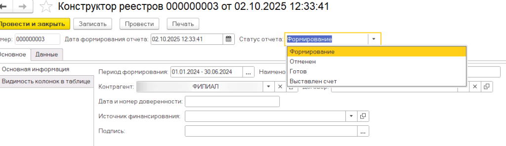 Ввели журнал статусов реестров («Черновик», «Сформирован», «Отправлен», «Оплачен»), чтобы сотрудники могли отслеживать, на каком этапе находится каждый документ. Это позволило отказаться от хранения данных в отдельных файлах и ручных согласований между отделами.
