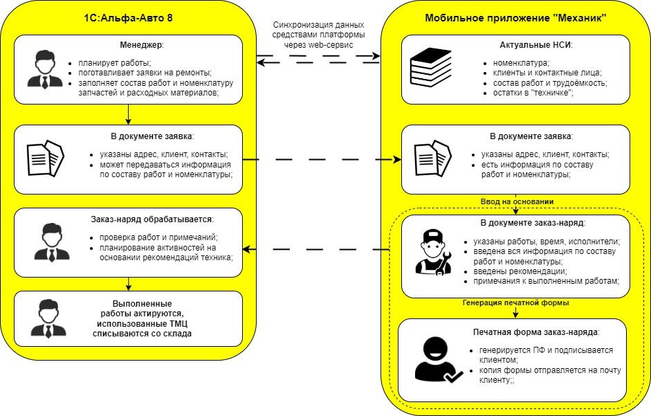Приложение упрощает работу персонала с документами «Заявка на ремонт» и «Заказ-наряд» за счет автоматизации ввода и обмена информацией |