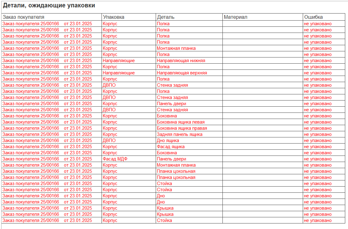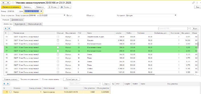 При формировании упаковки сотрудник подразделения открывает документ в программе 1С:УНФ, в котором отражаются все детали заказа. По мере перемещения деталей в упаковку сотрудник их сканирует. После того как упаковка готова — формирует и печатает штрихкод. Система проверяет комплектность деталей. Упаковать деталь, которая не относится к данному заказу, не получится. Настроено предупреждение: при обнаружении ошибок блокируется формирование упаковки до их полного устранения.