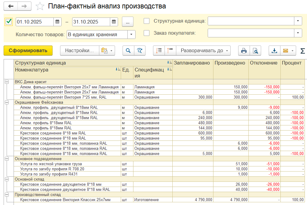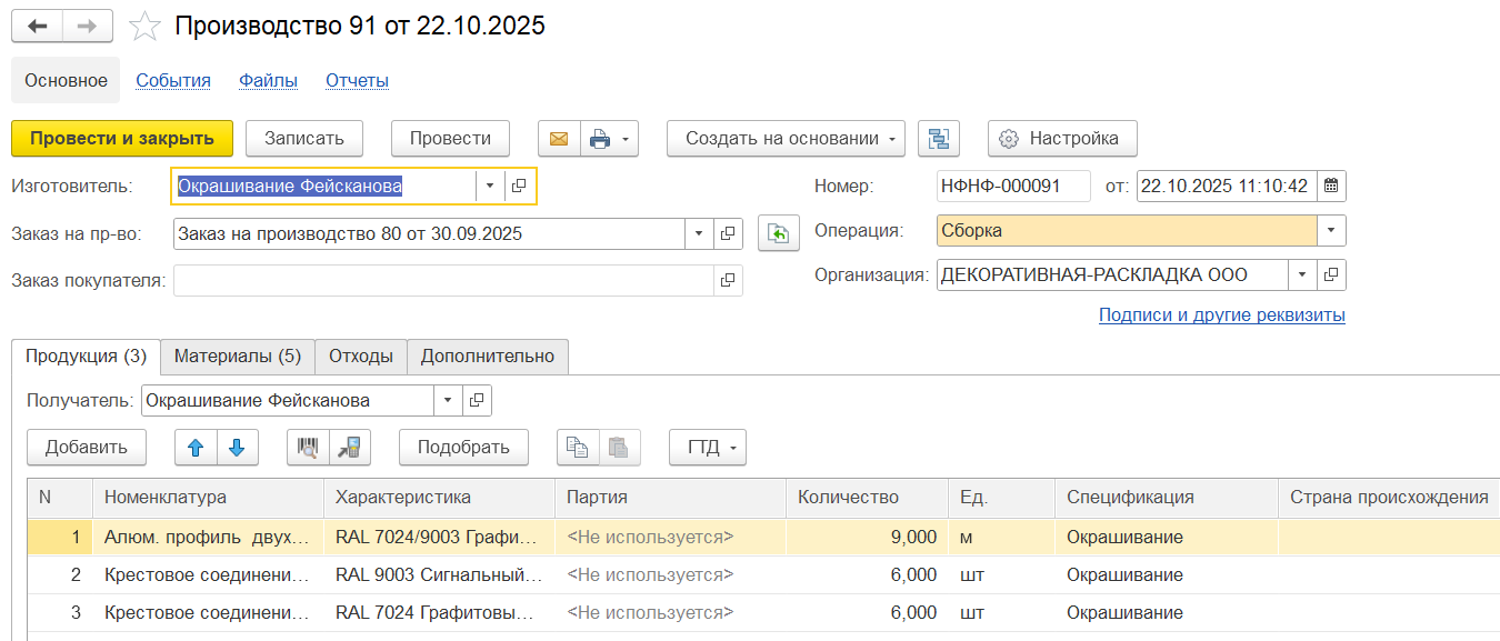 В рамках данных работ выполнена настройка функциональных опций по блоку «Производство», настроены цепочки документов по отражению операций производства, настроены права пользователей, проведено обучение ответственных пользователей за этот блок, настроены аналитические отчеты для отражения реальной картины производственного цикла на предприятии.