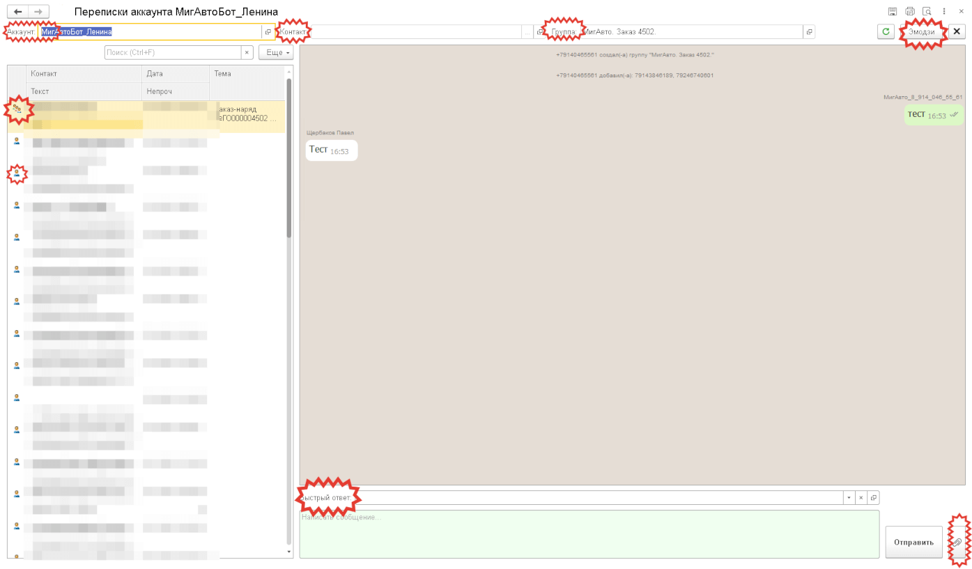 - «Группа по заказ-наряду». Такой подход в разы уменьшил хаос в переписке с клиентами, у которых несколько автомобилей, и с корпоративными заказчиками. Статусы «Принят"/"В работе"/"Ожидаем запчасть"/"Готов"/"Выдан» приходят триггерами по событиям 1С.