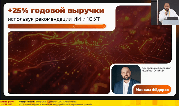 +25% годовой выручки используя рекомендации ИИ и «1С:Управление торговлей» (12-й Бизнес-форум 1С:ERP 20 ноября 2025 г., Федоров Максим, ООО «Конкор-Оптика»)