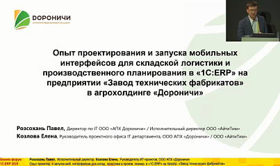 Опыт проектирования и запуска мобильных интерфейсов для складской логистики и производственного планирования в «1С:ERP» (12-й Бизнес-форум 1С:ERP 20 ноября 2025 г., Розсохань Павел, Козлова Елена, ООО АПХ «Дороничи»)