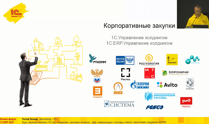 Корпоративные закупки в линейке «1С:Управление холдингом»: экономия на масштабах, эффективные коммуникации с поставщиками и внутренними заказчиками, поддержка 223-ФЗ (12-й Бизнес-форум 1С:ERP 20 ноября 2025 г., Попов Леонид, «1С»)