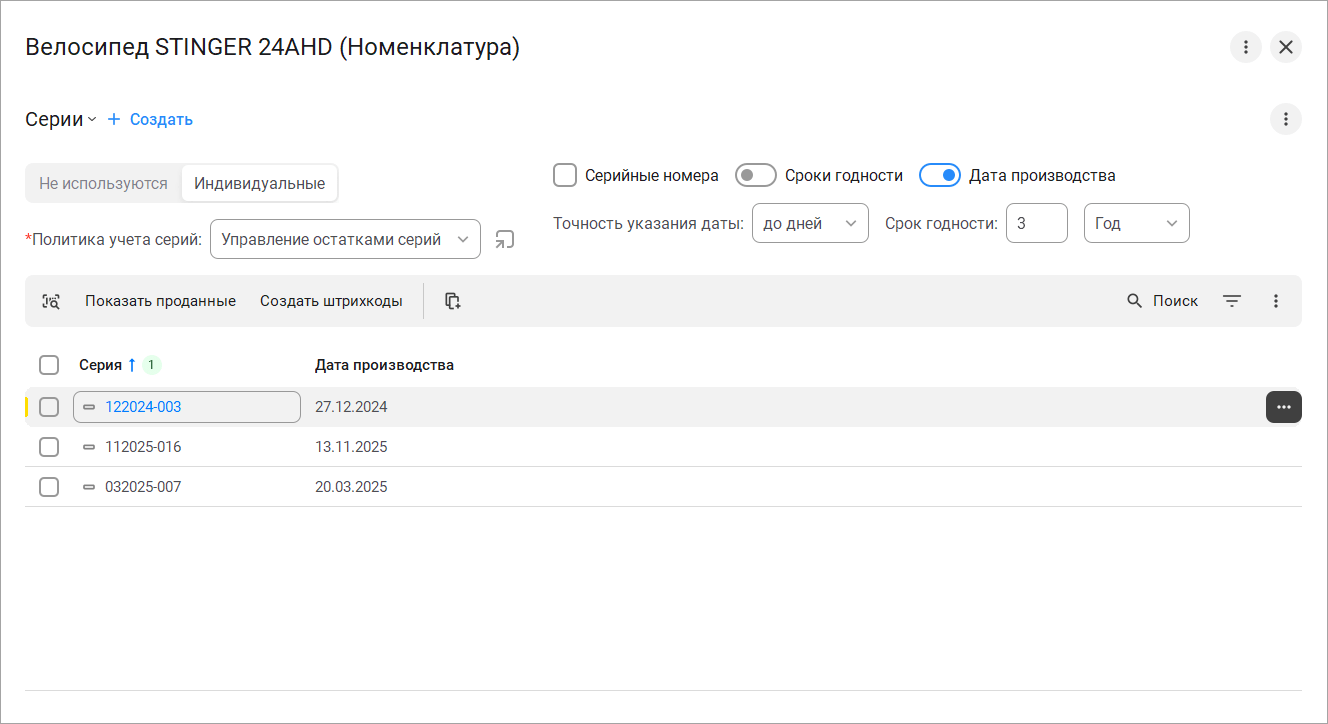 Серии можно указывать справочно или контролировать по ним остатки. Учет товаров по сериям дает возможность отличать конкретный экземпляр товара или часть товарных запасов от остального объема товаров того же наименования.