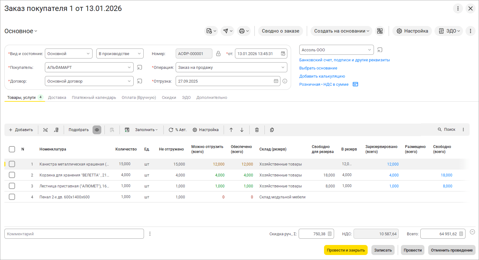 Резервирование. Заказанный покупателем товар можно зарезервировать на складе с помощью документов «Заказ покупателя» или «Резервирование запасов». Менеджер, зарезервировав товар под конкретный заказ, может быть уверен, что покупатель получит свой товар в срок. Перед закупкой и резервированием можно узнать свободные остатки на складах. Режим «око» позволяет видеть остатки, резервы и обеспечение по заказу.