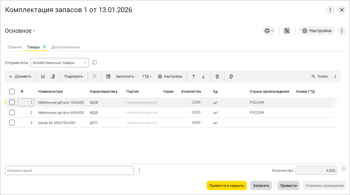 Комплектация. На складе можно собрать из товаров комплекты для продажи с помощью документа «Комплектация запасов». Комплекты создаются в нескольких вариантах. Готовые комплекты можно учитывать и перемещать между складами. Остатки комплектов всегда можно посмотреть в отчетах и при подборе товара.