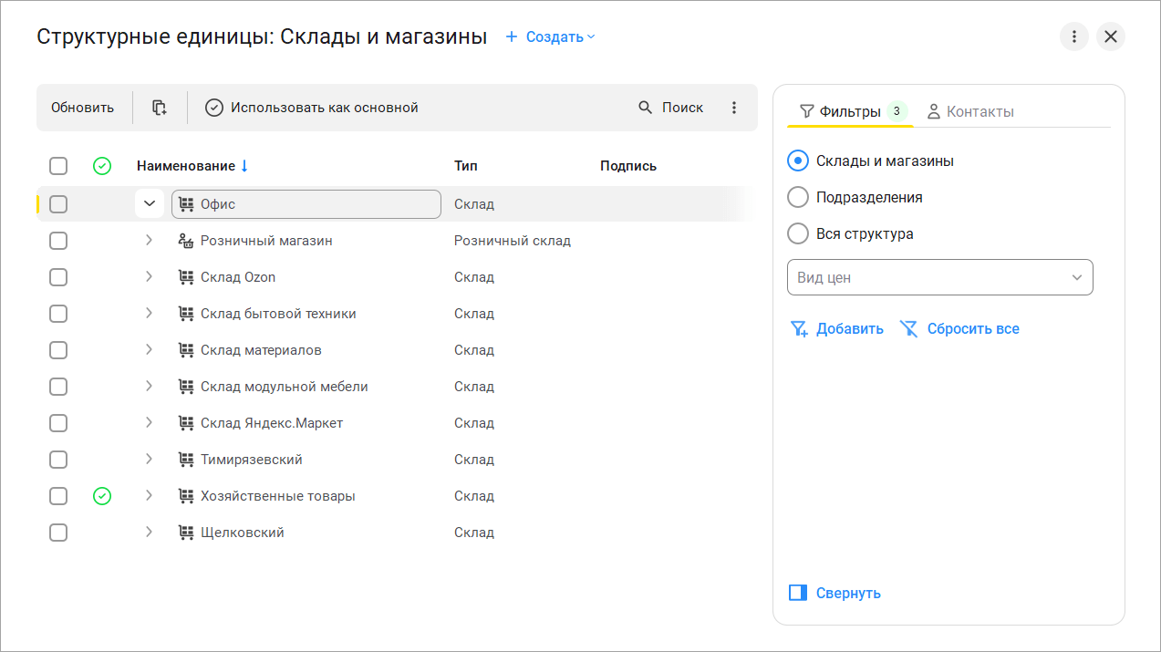 Склады можно создать и настроить с учетом специфики вашего бизнеса. Например, создать склад для розничного магазина и разрешить продажу с этого склада только по розничной цене.