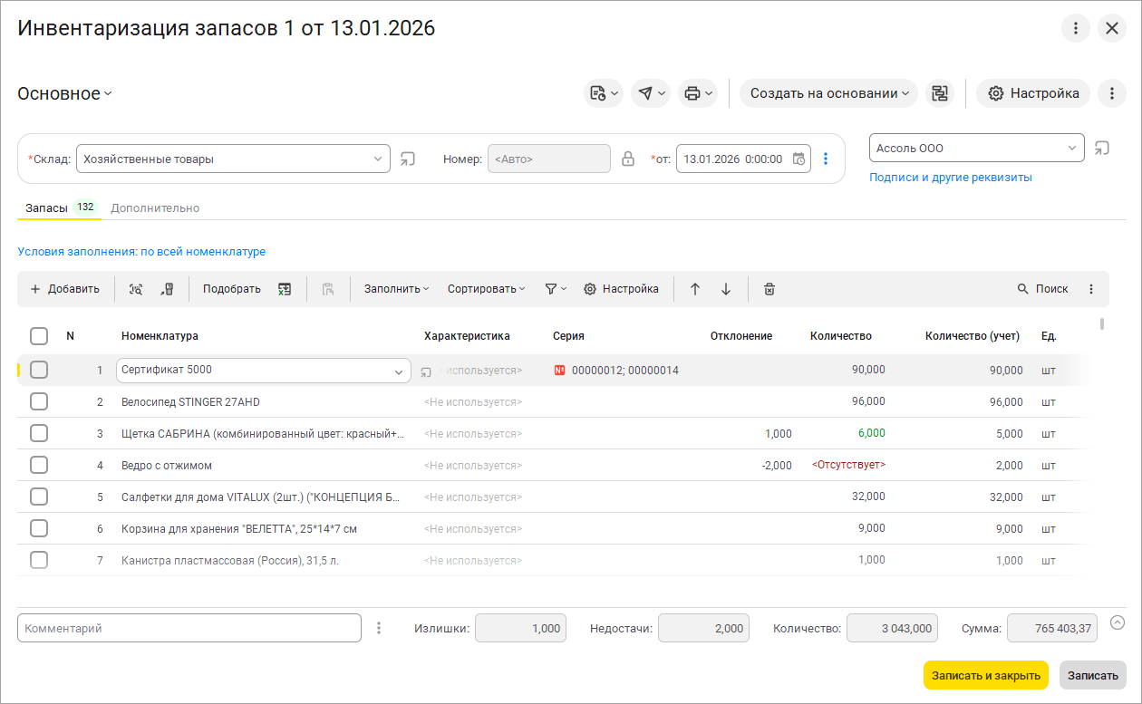 Списание недостачи. Если во время инвентаризации была обнаружена недостача, то можно провести списание запасов. Документ «Списание запасов» можно создать и в случае произвольного списания товаров.