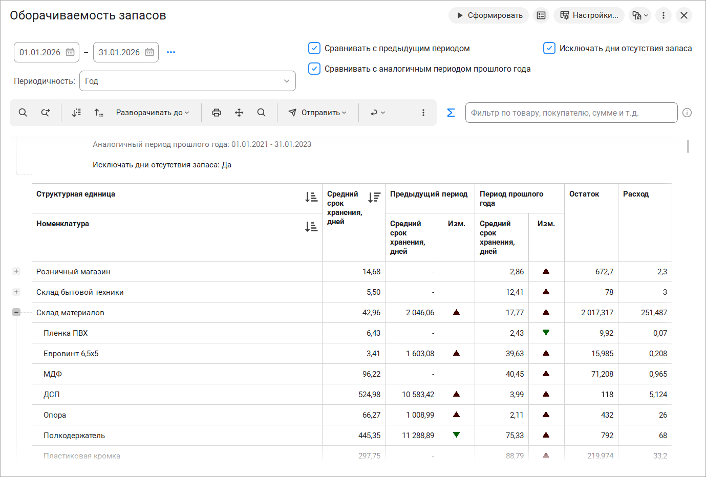 Отчет «Оборачиваемость запасов» позволяет получить и проанализировать показатели «Оборачиваемость» и «Средний срок хранения (дней) запасов». Из отчета сразу можно увидеть самые оборачиваемые и неликвидные товары.