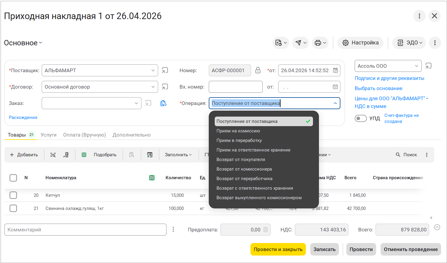 - Закупка товаров на основании учетных документов.