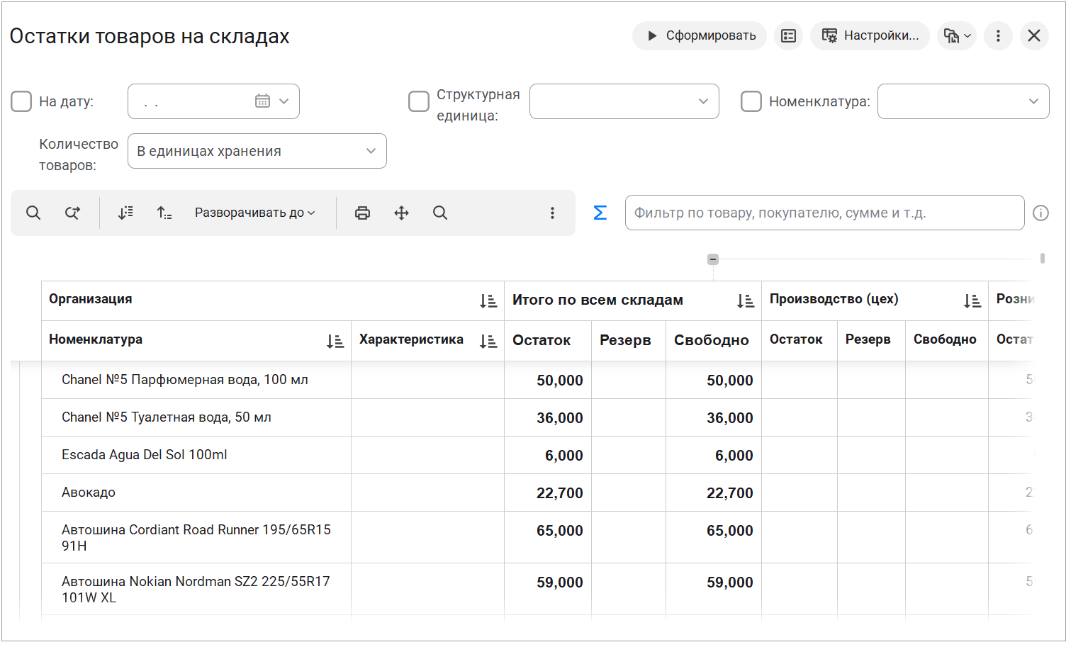 - Для наиболее точной оценки движения товаров и запасов информацию можно детализировать вплоть до конкретной номенклатуры.
