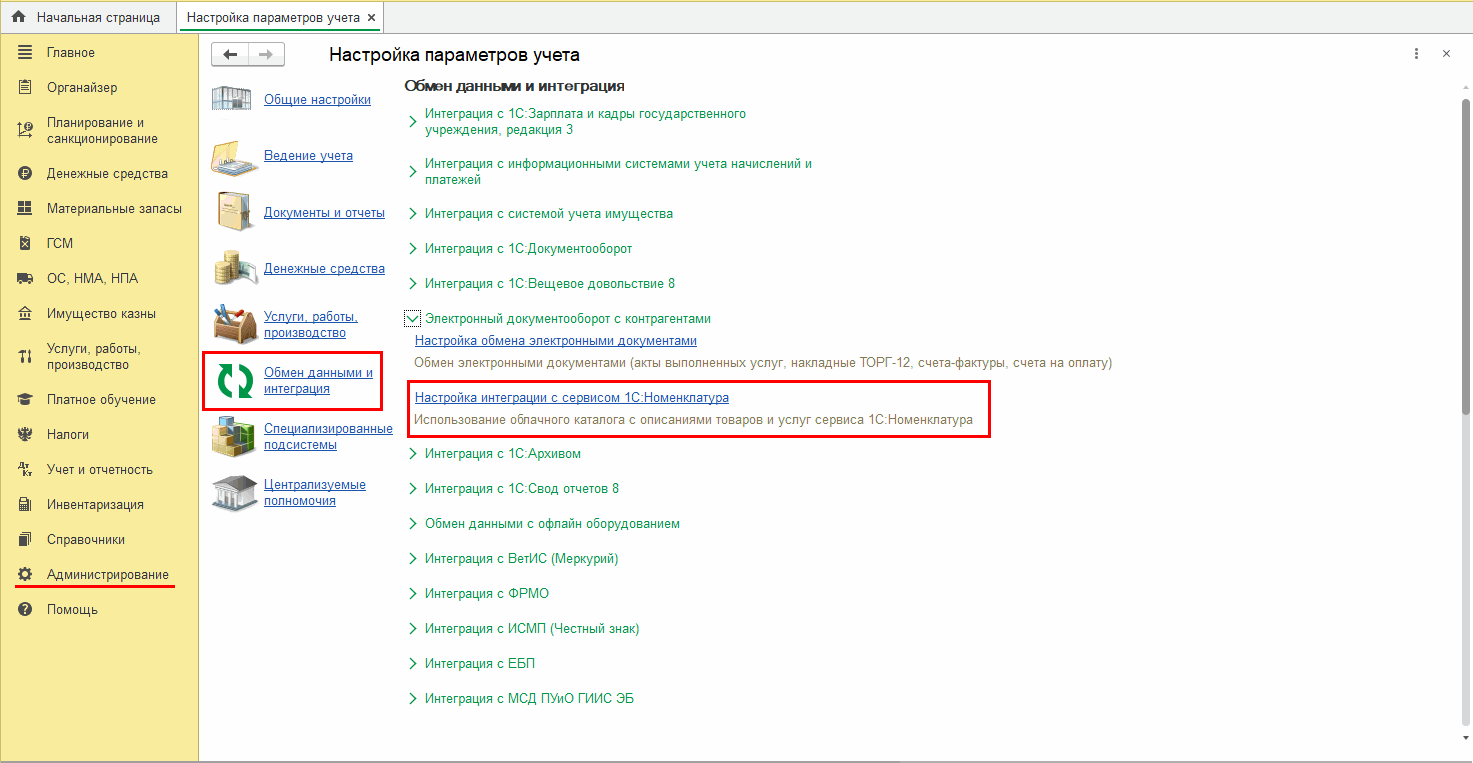 В программе реализована интеграция с сервисом "1С:Номенклатура". Сервис "1С:Номенклатура" – это единый каталог описаний товаров и услуг (далее - карточек товара), используемых в конфигурациях на платформе "1С:Предприятии 8". Карточка товара содержит наиболее часто требуемые свойства товара, необходимые для заведения номенклатурной позиции в учетных системах, такие как: наименование, ставка НДС, единица измерения и прочие.