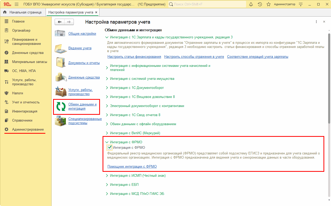 В программе реализована интеграция с Федеральным реестром медицинских организаций (ФРМО), который является частью Единой государственной информационной системы в сфере здравоохранения (ЕГИСЗ) и предназначен для ведения учета и синхронизации данных в части оборудования.