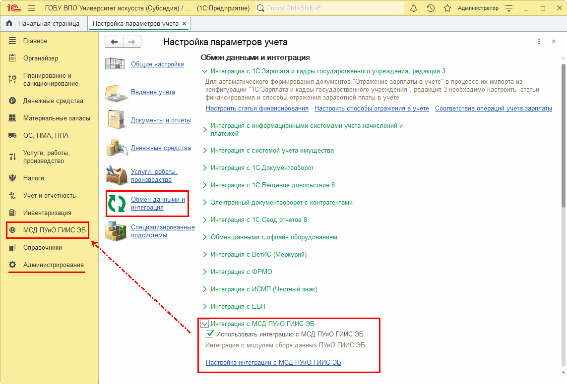 В программе "1С:Бухгалтерия государственного учреждения 8" редакции 2 реализована подсистема для интеграции с Модулем сбора данных ПУиО ГИИС "Электронный бюджет", обратиться к которой можно в разделе Обмен с МСД ПУиО ГИИС ЭБ.