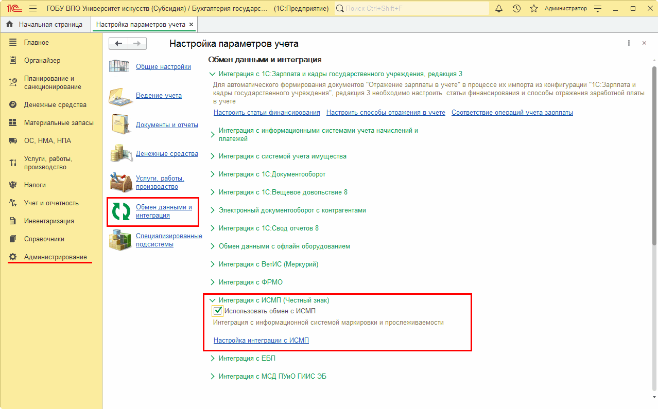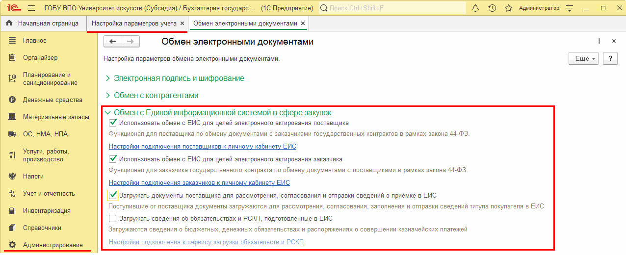 Также можно включить и настроить обмен с личным кабинетом заказчика в ЕИС для получения электронных документов ЕИС для рассмотрения, заполнения титула покупателя, отправки в ЕИС и для отражения в учете.
