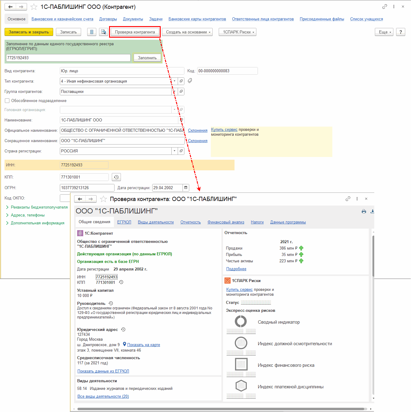 Вся информация, которую предоставляет сервис "1С:Контрагент", формируется из открытых источников данных, таких как ЕГРЮЛ/ЕГРИП, Росстат (данные о бух. отчетности), Единый реестр проверок и т.д.