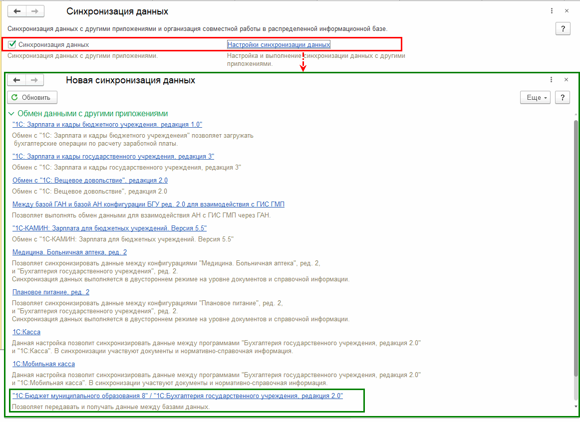 Включены механизмы обмена данными с программами "1С:Бюджет муниципального образования 8" и "1С:Бюджет поселения 8". Синхронизация данных производится на уровне передаваемой из "1С:Бухгалтерии государственного учреждения 8" информации о бухгалтерских операциях (бухгалтерских справок).