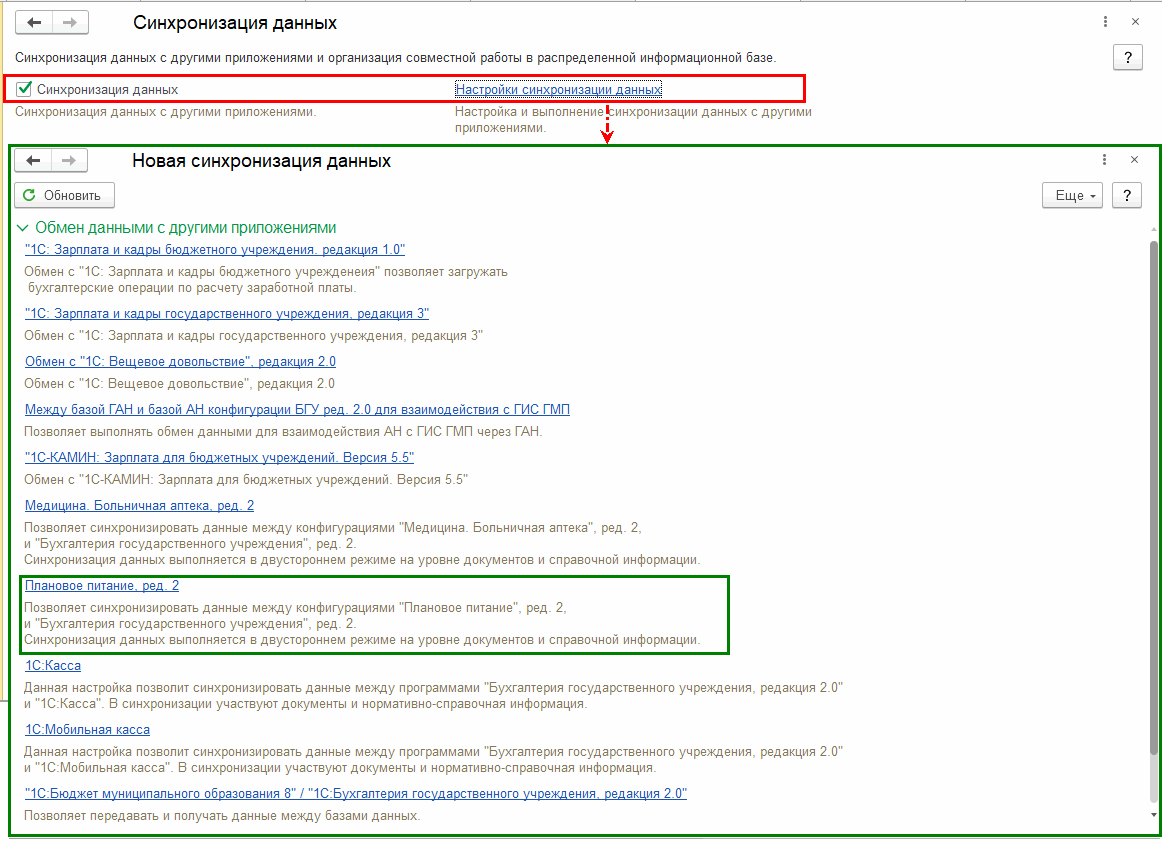 В конфигурацию включены механизмы обмена данными с конфигурациями линейки "1С:Плановое питание": "1С:Дошкольное питание", "1С:Школьное питание", "1С:Медицина. Диетическое питание", "1С:Комбинат плановое питание".