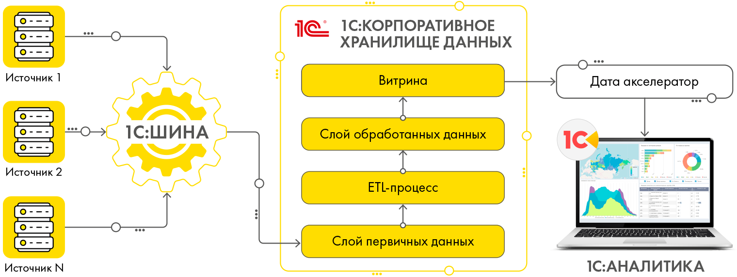 «1С:Корпоративное хранилище данных» (1С:КХД) — это новое прикладное решение на платформе «1С:Предприятие 8», призванное радикально упростить и автоматизировать формирование аналитической отчетности на вашем предприятии. Это мощный инструмент, который позволяет в единой базе собирать, обрабатывать и централизованно хранить данные из различных информационных систем. На основе этих консолидированных данных вы сможете создавать наглядные, детализированные отчеты и дашборды в системе «1С:Аналитика».