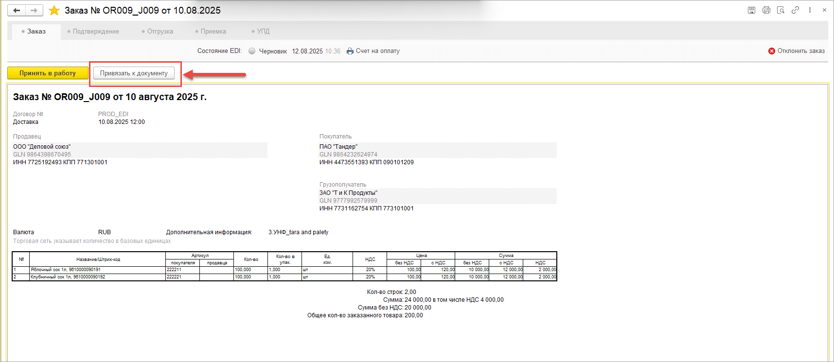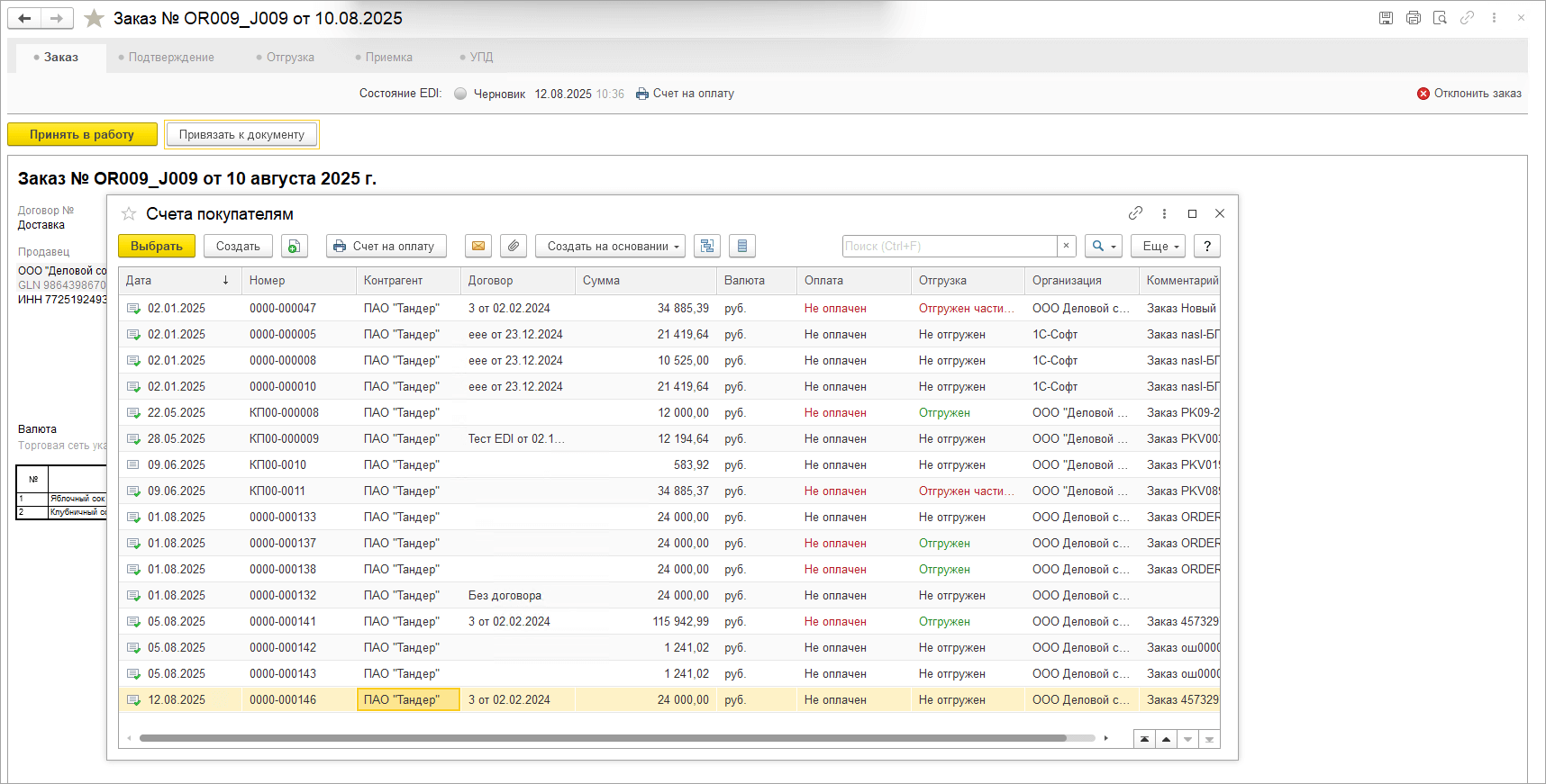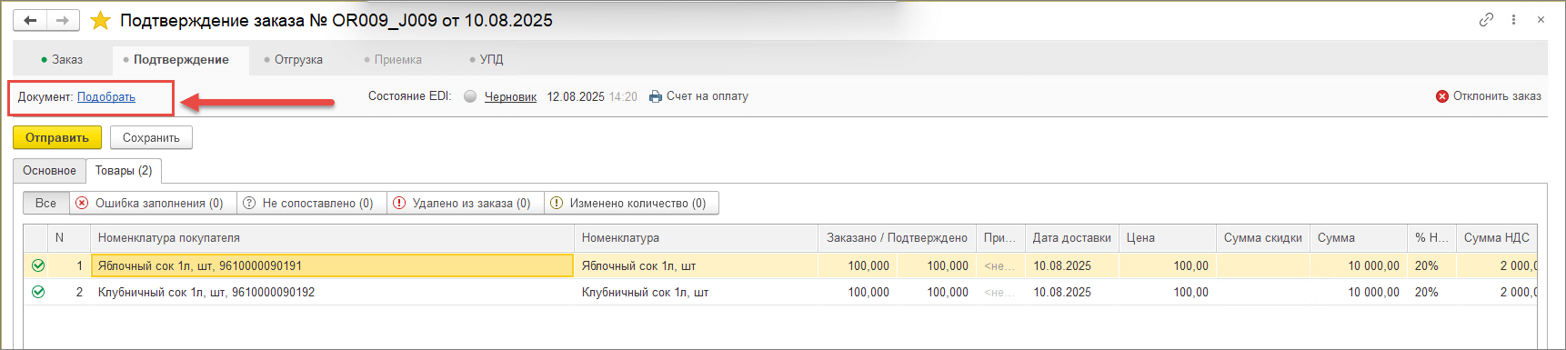 Подобрать документ из базы 1С можно до тех пор, пока не отправлен EDI-документ Подтверждение заказа или не сформирован черновик на стадии Отгрузка и УПД. Если необходимо скорректировать привязку документа заказа, то требуется поэтапно убрать документы отгрузки и УПД на соответствующих вкладках и перевести Подтверждение заказа в состояние черновика, только после этого можно будет привязать заказ к другому учетному документу.