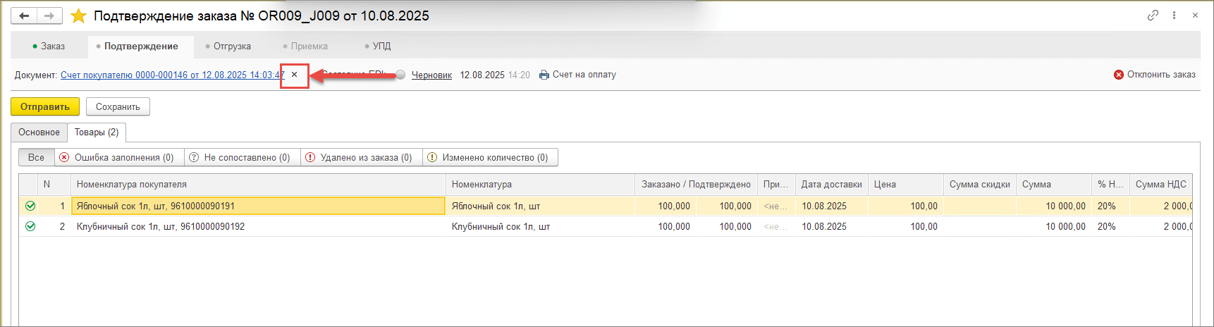 1. Изменить сопоставление номенклатуры можно в процессе обработки заказа, на любом этапе цепочки («Подтверждение заказа», «Отгрузка», «УПД/Корректировка»).